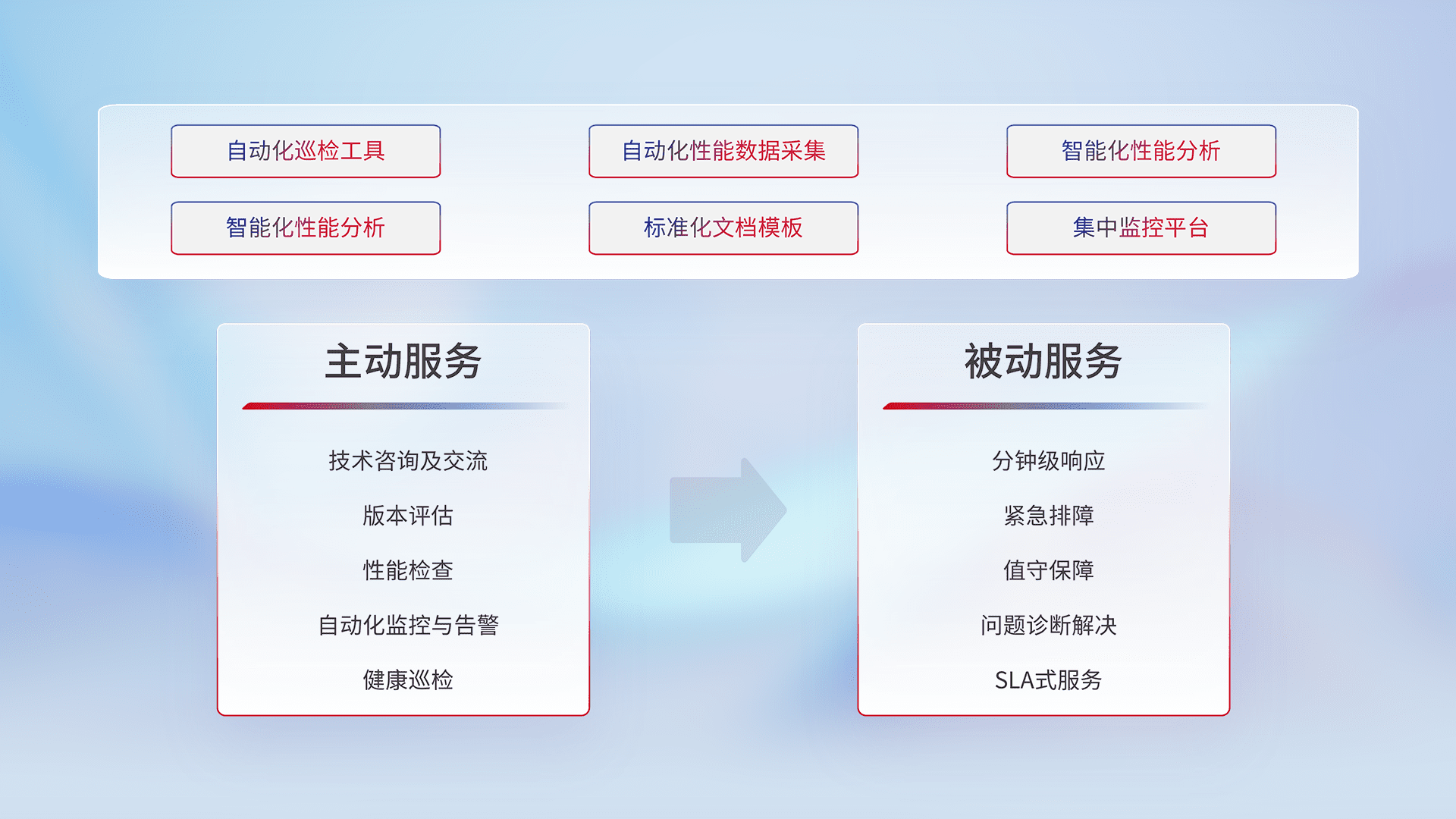 智能化工具和标准化文档,,,保障服务质量,,提供主动服务(包含技术咨询、、、版本评估、、、、性能检查、、、自动化监控与告警、、、健康巡检)和被动服务包含(分钟级响应、、、、紧急排障、、、值守保障、、、、问题诊断解决、、SLA服务)。。。